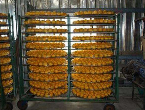 1、將新鮮柿子洗干凈,去皮,裝入托盤,放置到推車上,推入烘干機房內,開始烘干。