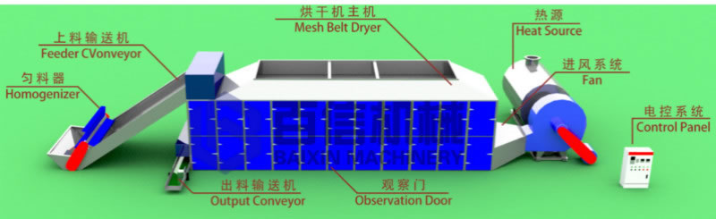 辣椒烘干機(jī)也是多層帶式辣椒烘干設(shè)備主要是有:上料系統(tǒng)、烘干系統(tǒng)、加熱系統(tǒng)、出料系統(tǒng)組成,分別包括上料輸送機(jī),均料器,烘干主機(jī),出料輸送機(jī)、大風(fēng)機(jī)、小風(fēng)機(jī)、熱源,傳動機(jī)和控制柜。